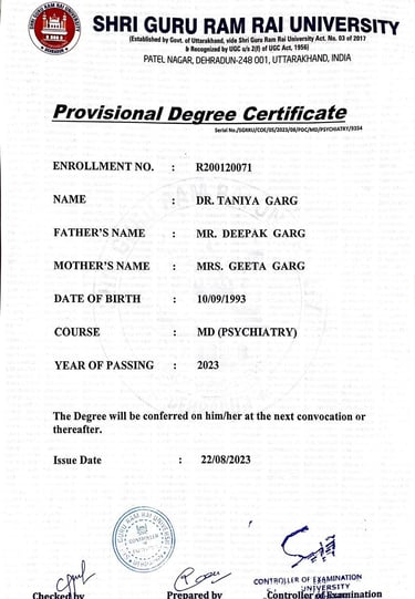 Dr. Taniya Garg is a qualified psychiatrist with specialized training in mental health and behavioral care. With a strong academic background and professional expertise, she plays a vital role in guiding individuals through their recovery journey.